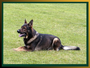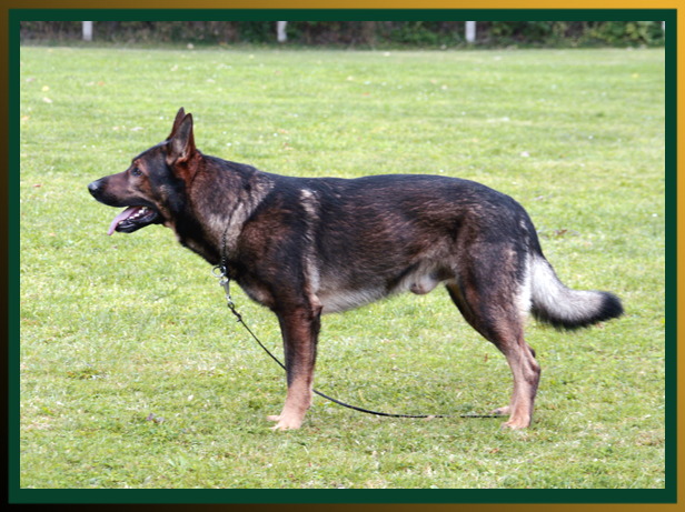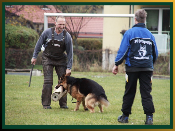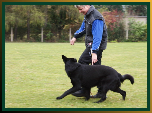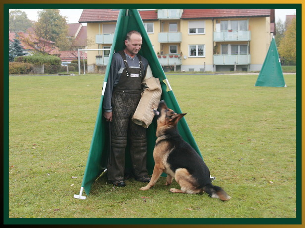 Ostara folgte mit dem Absuchen der Revierzelte und der Verfolgung sowie Unterbindung der Flucht des Helfers aus einem Versteck. Bei der Kampfeinstellung zeigte sie gehorsam das Aus mit lautstarkem Bewachen des Helfers und anschließendem Abtransport als Seitentransport. |