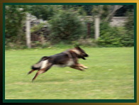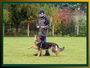 Sie zeigten ein sehr schönes Platz aus dem Laufschritt mit abrufen und anschließendem Steh aus dem Laufschritt. Das Steh klappte leider nicht so wie es sollte, aber wir können ja noch üben! Dafür zeigte Mick ein sehr schönes Kriech und weiter die perfekte Ausführung von Sitz / Platz / Steh auf der Position und Entfernung durch Zeichen und Kommando. |