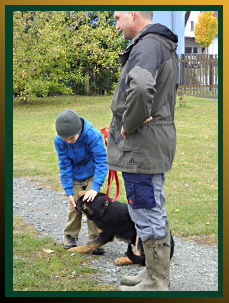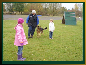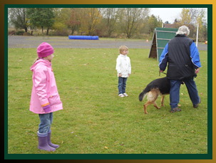 und im fließenden Übergang zeigte der nächste Hund Raika mit Brigitte die Fußarbeit mit Triebziel Ball und anschließend gleich noch das Durchlaufen einer Menschengruppe. Natürlich durften auch zwei Kinder hier behilflich sein. |