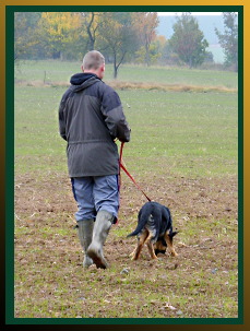 Jetzt war es an der Zeit unsere gelegten Fährten zu suchen. Also sind wir wieder zu dem besagten Feld hinter der Schule gelaufen und haben als ersten Sucher unseren jüngsten Teilnehmer Yukon gesehen. |