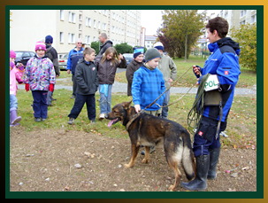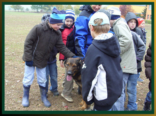 Yukon, hier mit Jörg als Führer, hatte eine ca. 15 m lange Futterfährte und hat sich so gleich sein Frühstück verdient. Das fanden die Kinder besonders toll, dass Yukon sein Frühstück suchen sollte! |
