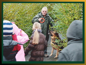 Yukon, hier mit Jörg als Führer, hatte eine ca. 15 m lange Futterfährte und hat sich so gleich sein Frühstück verdient. Das fanden die Kinder besonders toll, dass Yukon sein Frühstück suchen sollte! |