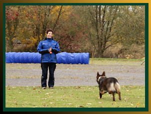 Sie zeigten ein sehr schönes Platz aus dem Laufschritt mit abrufen und anschließendem Steh aus dem Laufschritt. Das Steh klappte leider nicht so wie es sollte, aber wir können ja noch üben! Dafür zeigte Mick ein sehr schönes Kriech und weiter die perfekte Ausführung von Sitz / Platz / Steh auf der Position und Entfernung durch Zeichen und Kommando. |